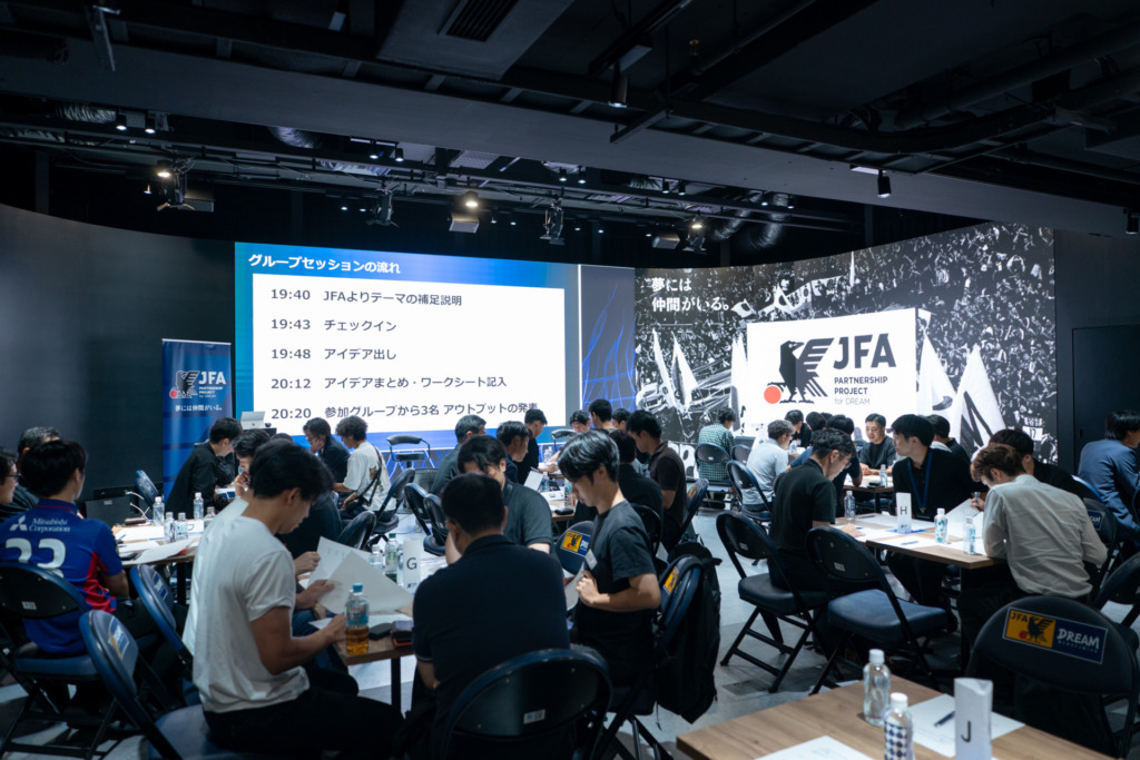 各々が興味のあるテーマごとにチーム分けされ、「JFAがライトファンとの接点を深めるには?」「日本で女子サッカーをメジャースポーツにするには?」「日本サッカーがアジアで稼ぐためには?」などのテーマについて、参加者が議論しました。