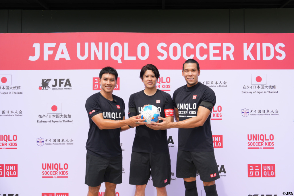 内田篤人さん(ユニクロサッカーキッズキャプテン)、Kawin Thamsatchananさん(元タイ代表ゴールキーパー)、Teeratep Winothaiさん(元タイ代表フォワード)