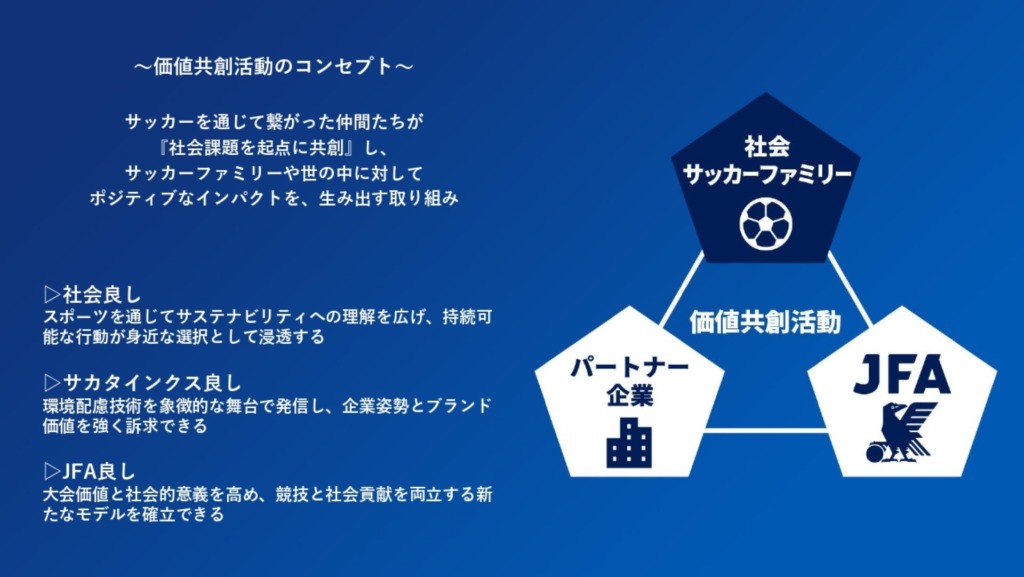 2025年、天皇杯JFA全日本サッカー選手権大会におけるパートナーシップの新たな取り組みとして導入されたのが、「天皇杯アスパス!パートナー」です。このパートナーシップは、天皇杯という注目度の高い舞台を通じて、サステナビリティへの貢献や社会課題への向き合い方を“見える化”するショーケースの場とすることを目的としています。2021年からスタートしたJFAのサステナビリティのプロジェクト「アスパス!」を媒体に、スポーツが持つ社会的影響力を未来につなげていくその第一歩として生まれました。