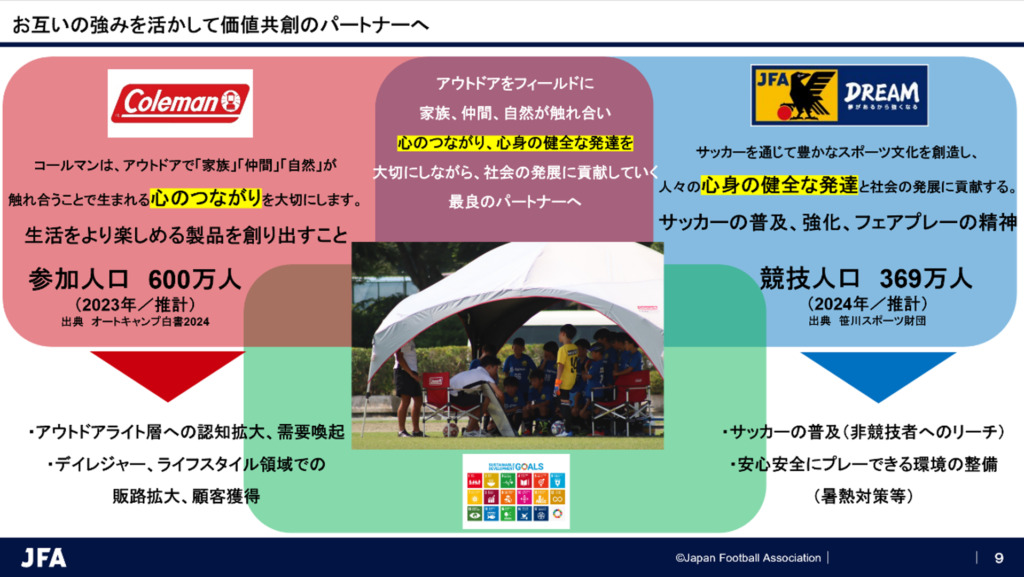 日本サッカー協会(以下、JFA)とニューウェルブランズ・ジャパン合同会社コールマン事業部(以下、コールマン)は、2026年1月にJFAソーシャルバリューパートナー契約の締結を発表しました。