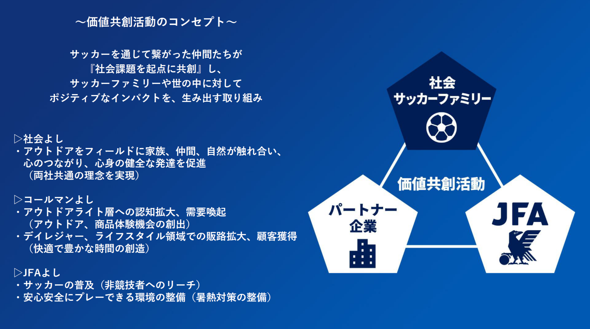 目的:「見る」「する」「関わる」といったさまざまなサッカーシーンにおいてコールマンのアウトドア商品を活用し、サッカーファミリーが安全に、快適にサッカーを楽しむ環境を広げていく。